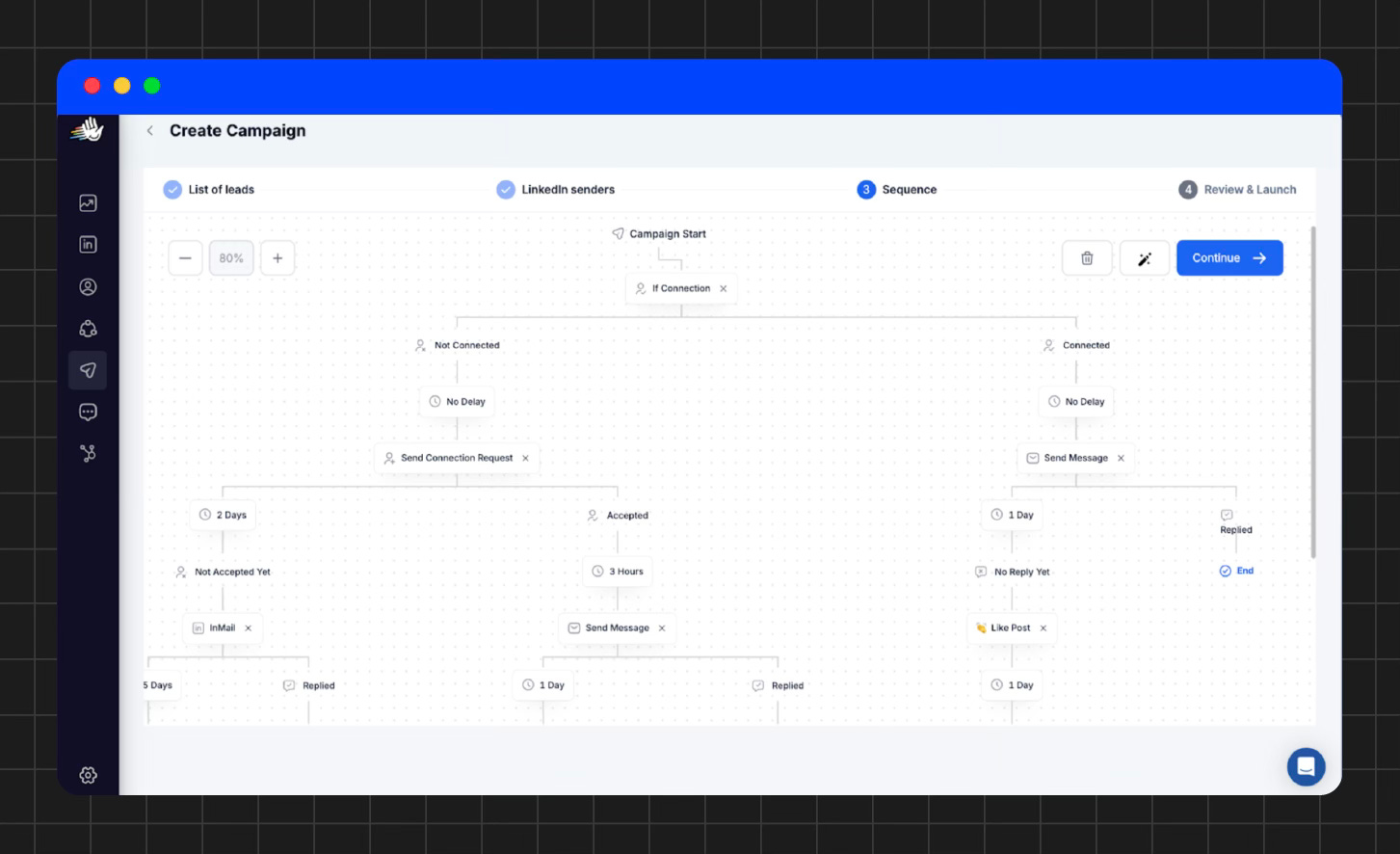 On LinkedIn, each campaign branches based on whether a contact is already connected or not: