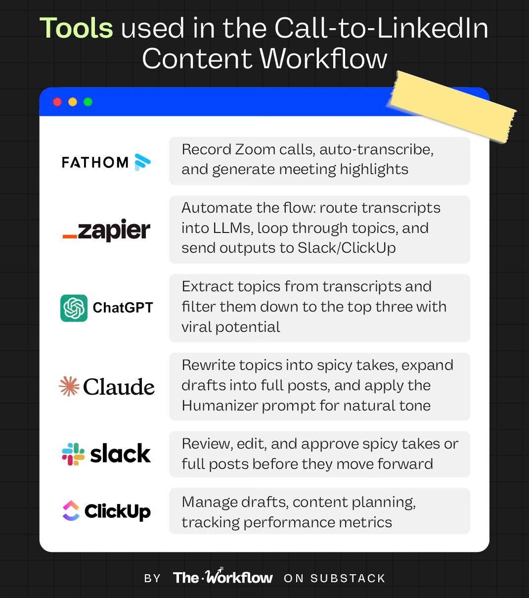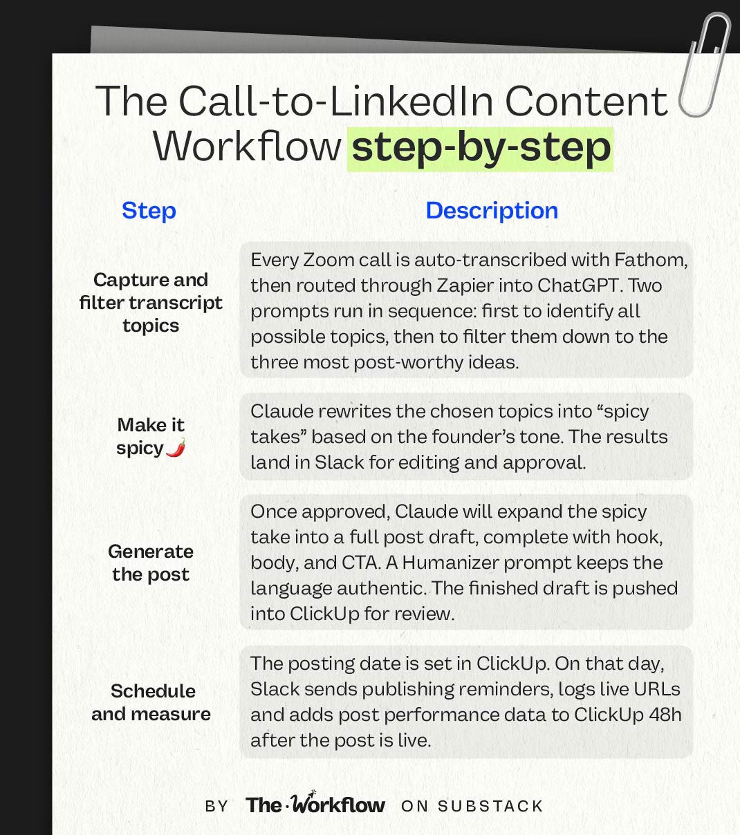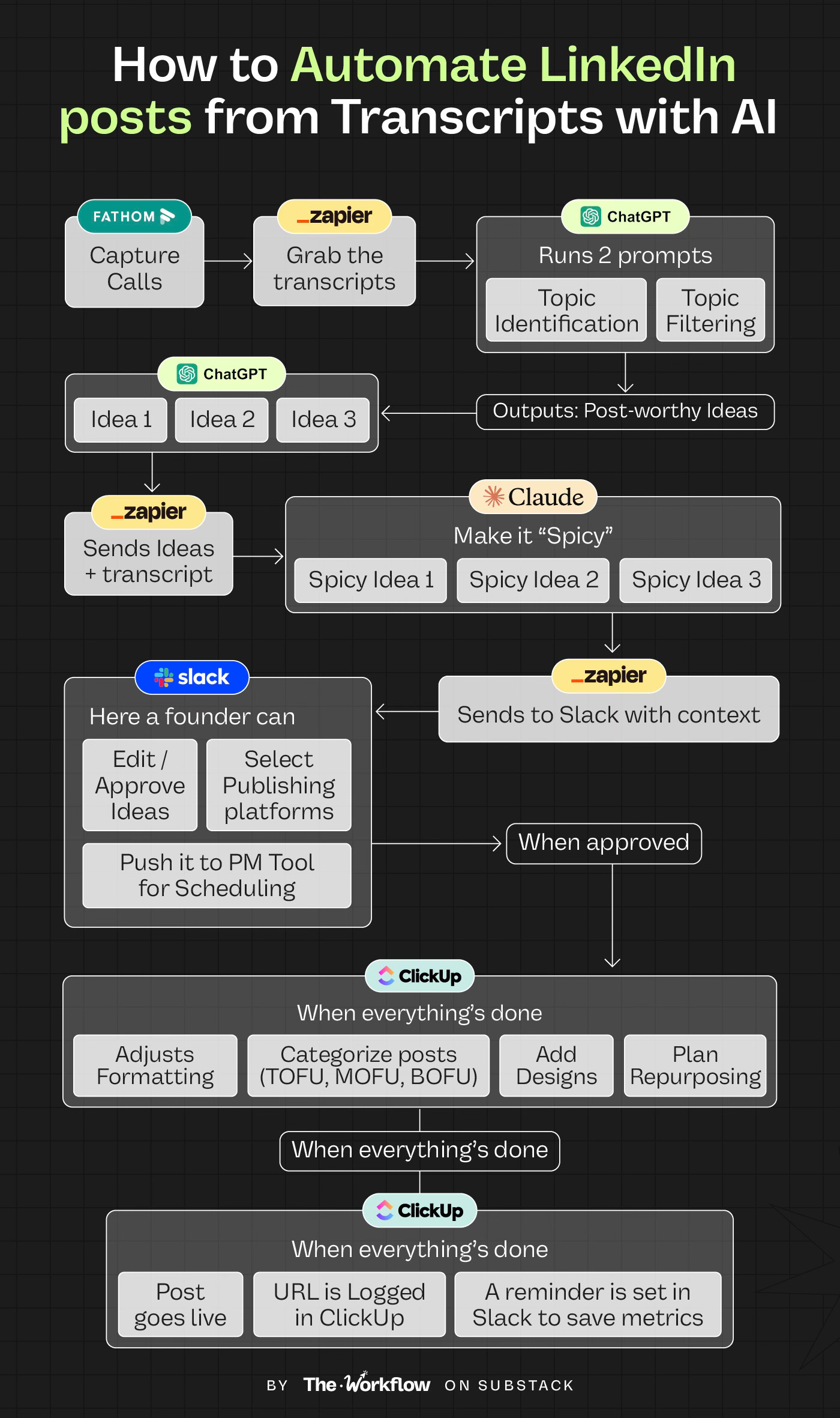 We’re starting to notice a clear pattern: the best workflows come from solving a personal pain first, then scaling, never from duct-taping 50 AI tools together. Grant’s calls were overflowing with content-worthy insights, but none of it was making it to LinkedIn. “I built this to keep up my LinkedIn game, and then founder friends started asking for it. That’s when I realized others might even pay for it,” he told us.