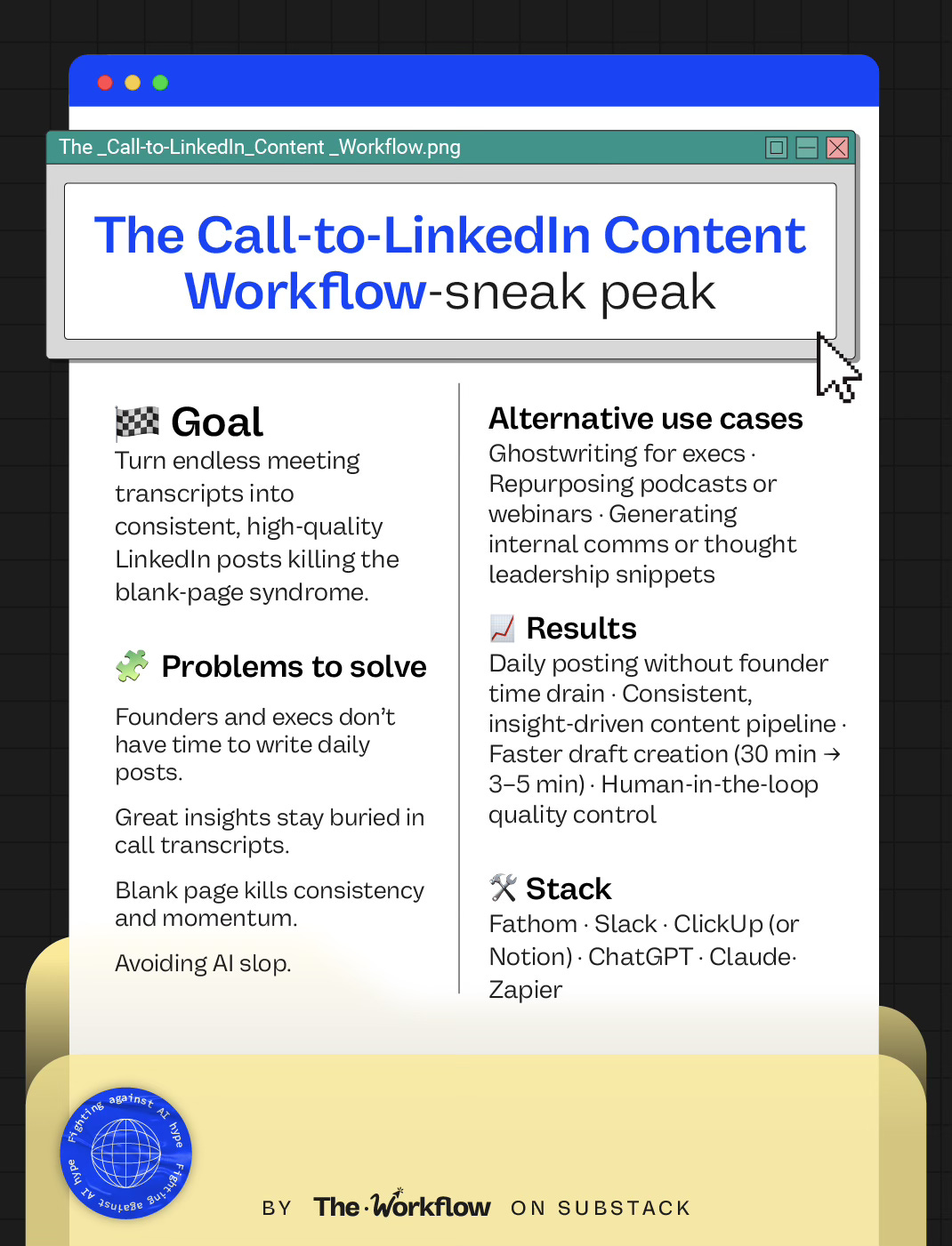 So, he built Call-to-Content to handle a few repetitive jobs: scan every Fathom transcript, pull out the quotable bits, and hand him ‘spicy takes’ to approve in Slack. It’s built for founder-led LinkedIn content, but works just as well for any exec, consultant, or team sitting on a mountain of transcripts. Sounds like AI scale and efficiency, minus the slop.