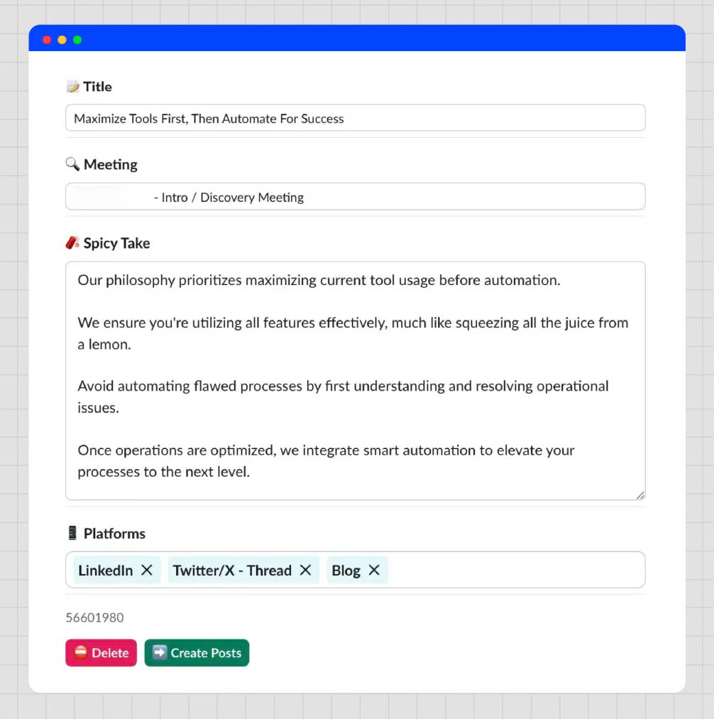 Consistency unlocked: reducing the time spent on each post from 30 minutes to 3–5 minutes with automated spicy takes as the draft.